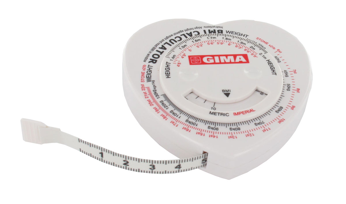 Pocket retractable tape measure 150 cm. BMI (Body Mass Index) calculator on front panel.