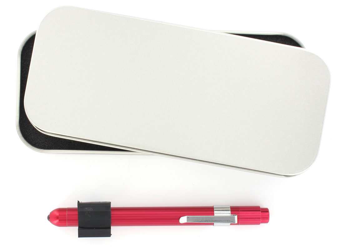Provided in aluminium box with batteries and clamps for tongue depressor.
