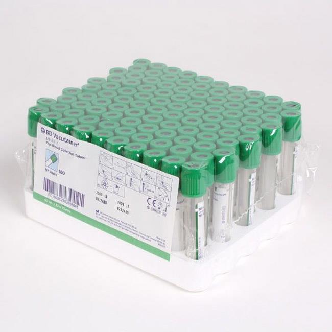 Venous blood sampling tube, vacuum packed, sterile, with lithium heparin, for plasma analysis.