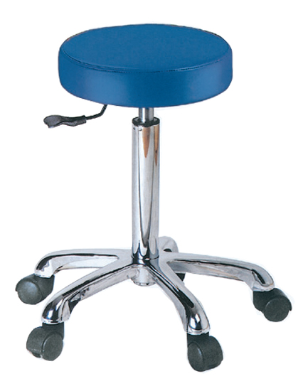Stainless steel stool with padded leatherette seat and castors. Height adjustable.