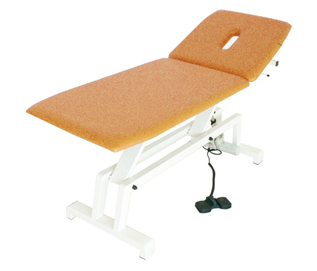 Sturdy and highly stable examination and treatment table. Adjustable by height electric foot switch. Fixed leg-section and manually adjustable head-section with mouth-nose hole.