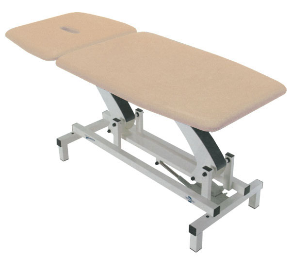 Examination and treatment with high stability. Electric height adjustment by a foot-switch (low tension 24 V) or manual by hydraulic piston