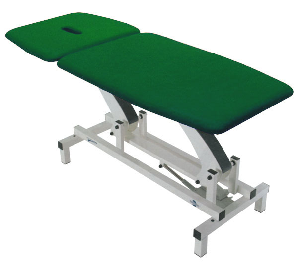 Examination and treatment with high stability. Electric height adjustment by a foot-switch (low tension 24 V) or manual by hydraulic piston