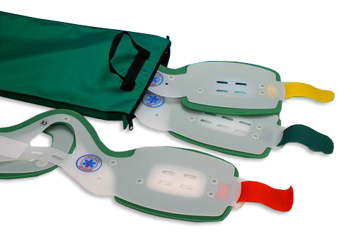Set of 6 one-piece first aid collars made of polyethylene with washable internal part made in EVA (kind of rubber) fixed to structure by plastic rivets.