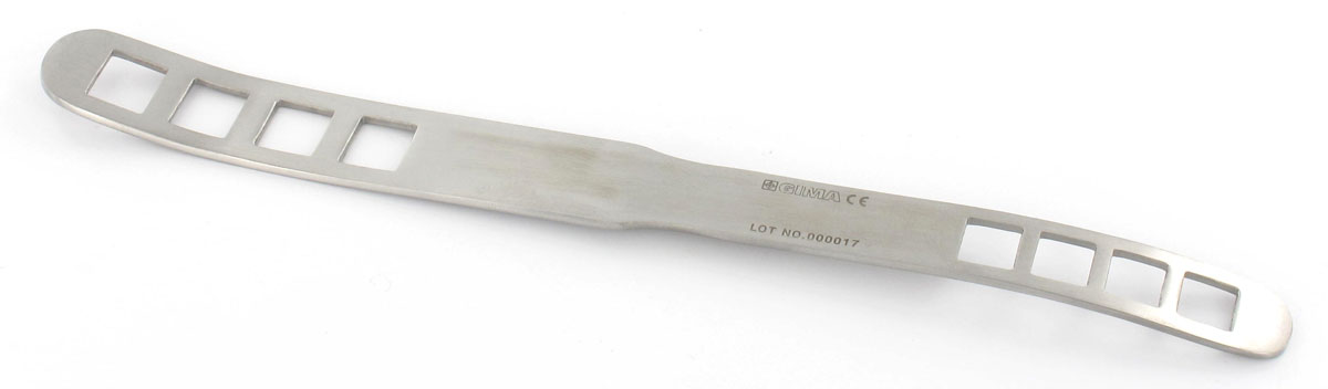 Bruenings fenestrated tongue depressor made of stainless steel.